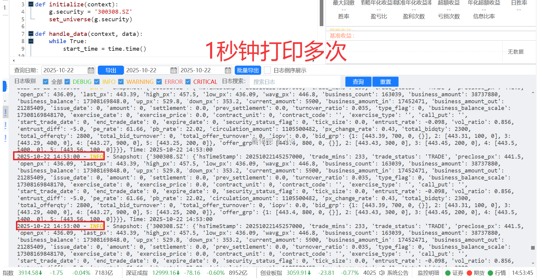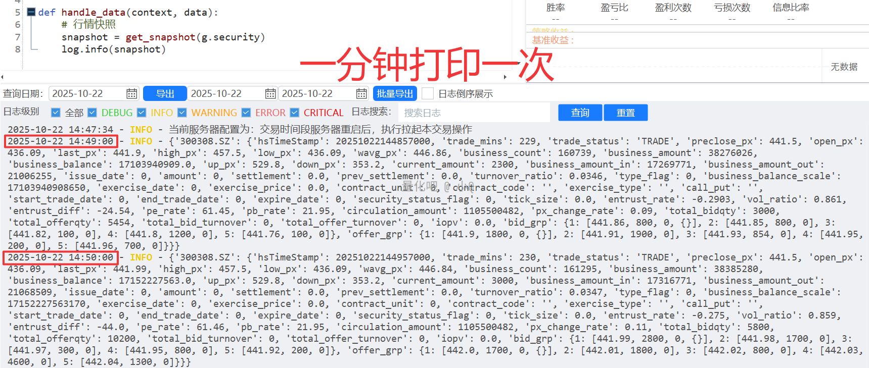 如果按照上面的框架去调用,结果其实不太满意!!因为仔细看是1min一次,这在短线策略里面明显无用的,因此我们需要进行" 优化“,通过“优化”,尽可能达到 满意。