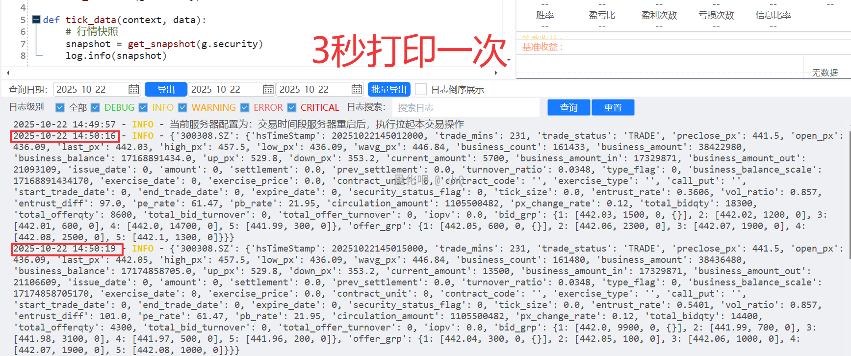 def initialize(context): g.security ='xxxxxx.SS set universe(g.security) def handle data(context,data): #行情快照 snapshot =get snapshot(g.security) log.info(snapshot)