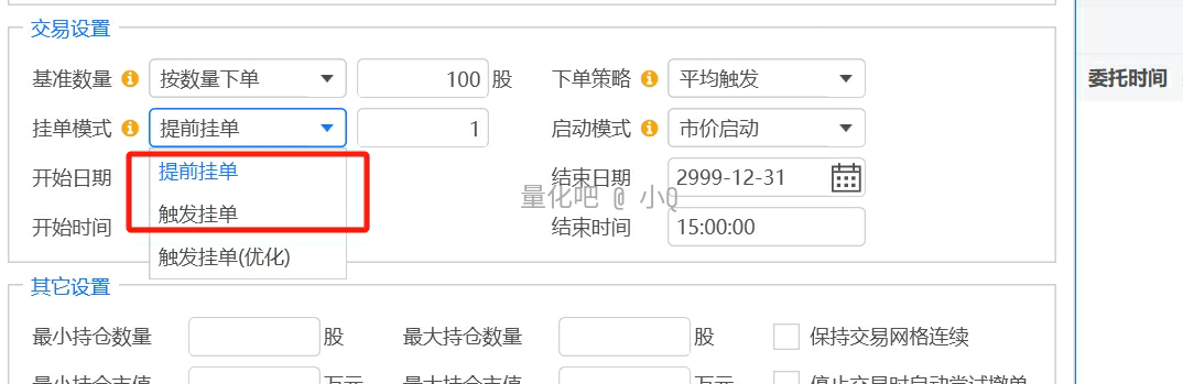 网格的下单模式 可以自主选择“ 提前挂单委托/ 触发挂单委托”, 也就是 成交驱动和到价触发 的模式 是可选。