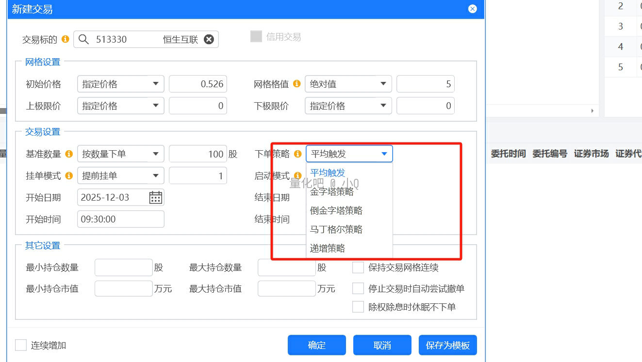 网格的下单策略 ,我们不仅可以选择常规的平均触发 ,还有“金字塔/倒金字塔 ,马丁格尔,递增等下单策略。