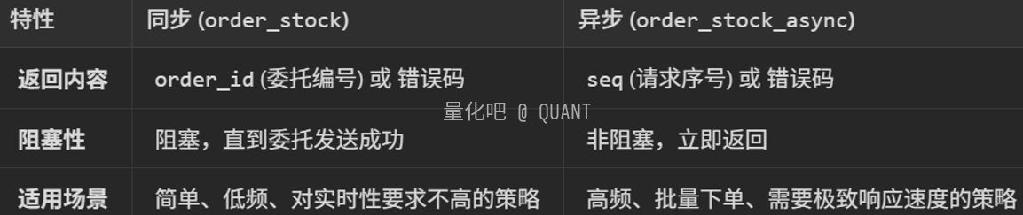 而异步方法,如 order_stock_async,则更高效。我们把下单指令交给它,它立刻回复:已执行,这是任务编号(seq)”,然后程序就可以马上去做别的事情了。它会在后台处理发送任务,处理完成后,再通过 on_order_stock_async_response 回调函数把正式的委托编号(order_id)给到我们