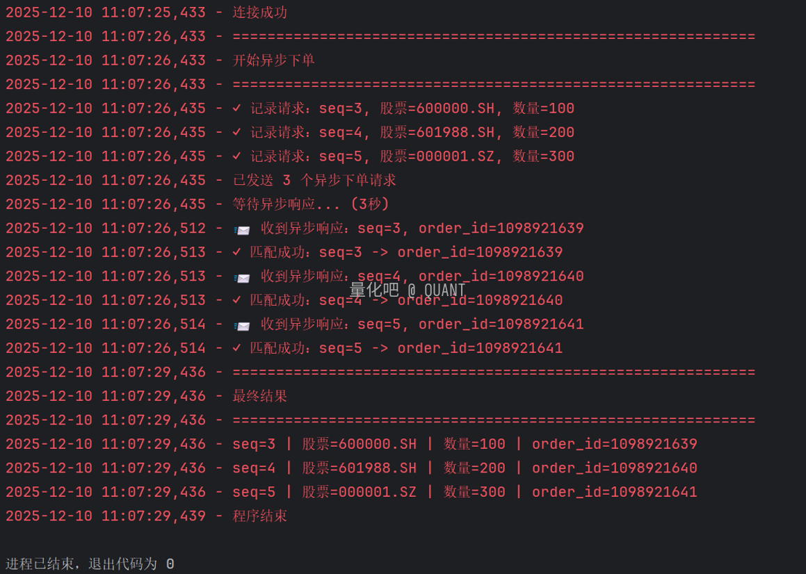 4. 回调通知:服务器处理后,on_order_stock_async_response 回调被触发,返回的 response 对象中同时包含了当初得到的 seq 和服务器生成的 order_id。