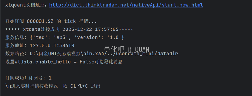print(f"时间: {data['time'][-1]}")第二步:订阅行情,并启动“接收模式”