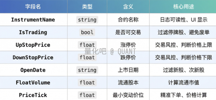 它会返回一个字典,包含该合约的关键属性,常用于策略中实现 代码转名称、涨跌停判断、交易状态检查等功能