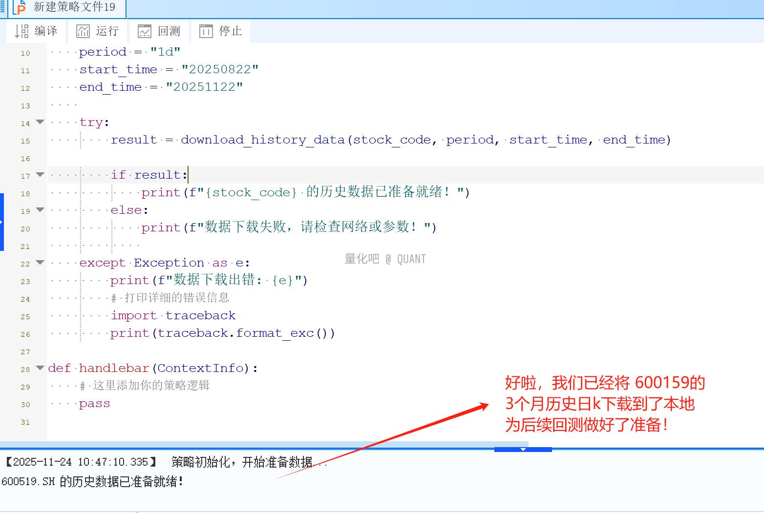 在“策略执行前”准备好充足的“粮草”(历史数据)。一次性将3个月的数据下载到本地,后续的回测和分析就可以直接从本地硬盘读取,速度极快,且不依赖网络连接。在策略的 init 初始化函数中,或者在一个专门用于数据准备的单独脚本中,在策略正式运行回测开始前,一次性调用。