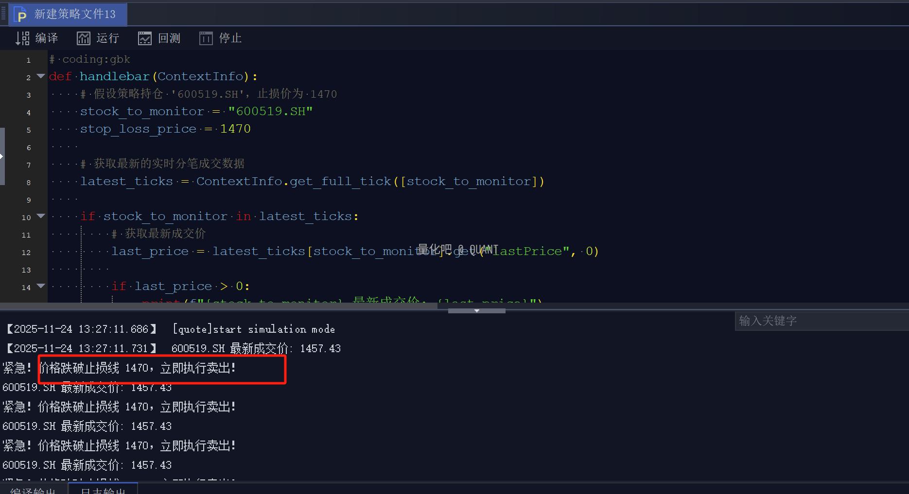 # 此处添加立即市价卖出的下单代码将本段代码我们复制到qmt去,看看输出结果: