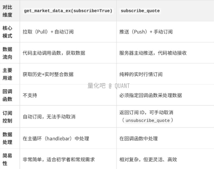 QMT中两种主流的实时行情订阅方式,虽然它们都能实现数据订阅,但在设计理念、使用方式和适用场景上存在显著差异。