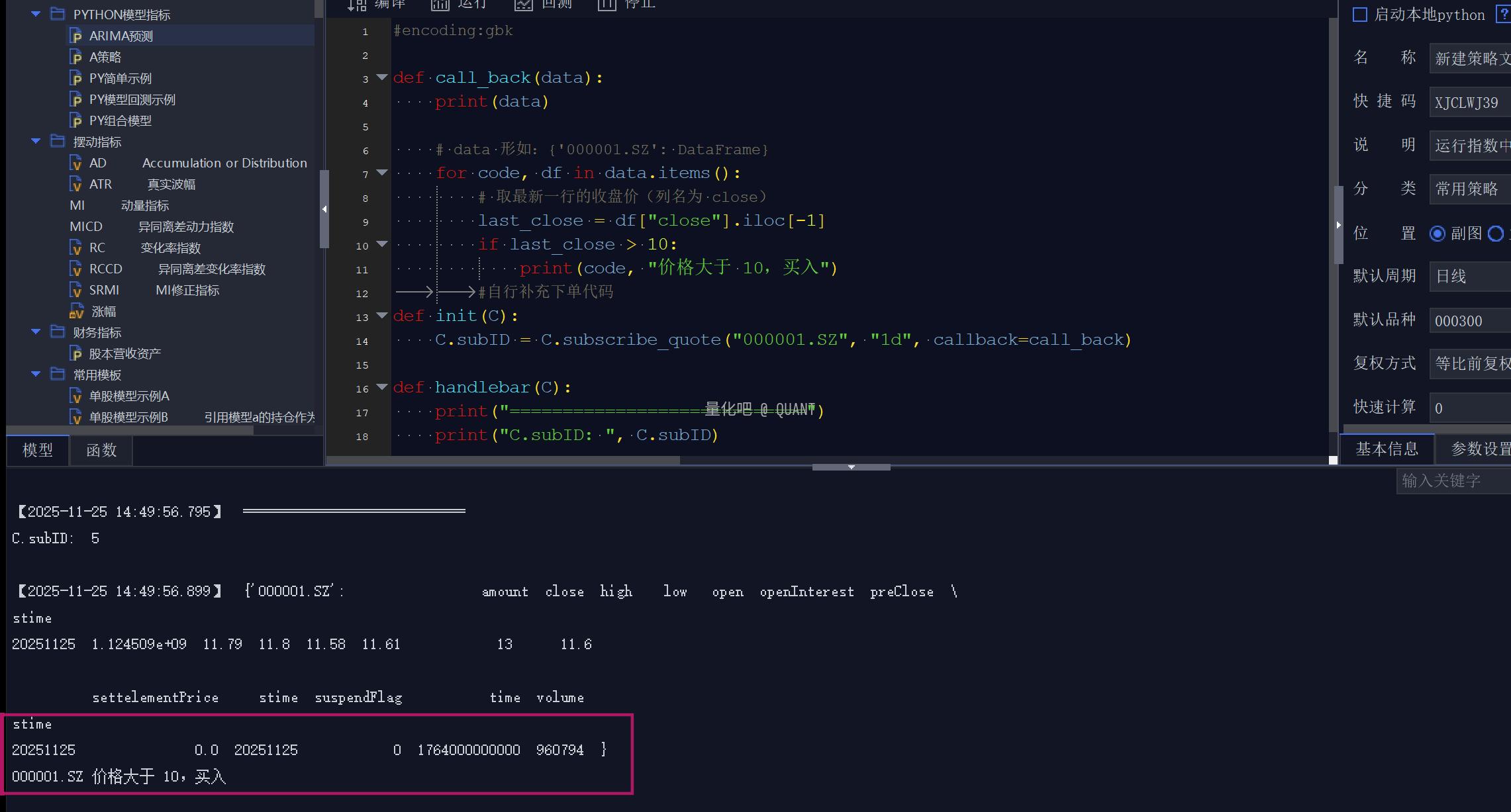 这种模式非常适合事件驱动的策略。例如,我们希望“一旦A股票的最新成交价突破10元,就立刻执行买入操作”。这种场景下,我们不需要反复去“拉取”数据,只需要在回调函数里设置好触发逻辑即可,效率更高,响应更及时。