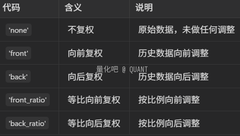 当公司分红或送股时,股价会调整。dividend_type 就是告诉我们:"这些数据是怎么处理的?是调整过的,还是没调整的?"