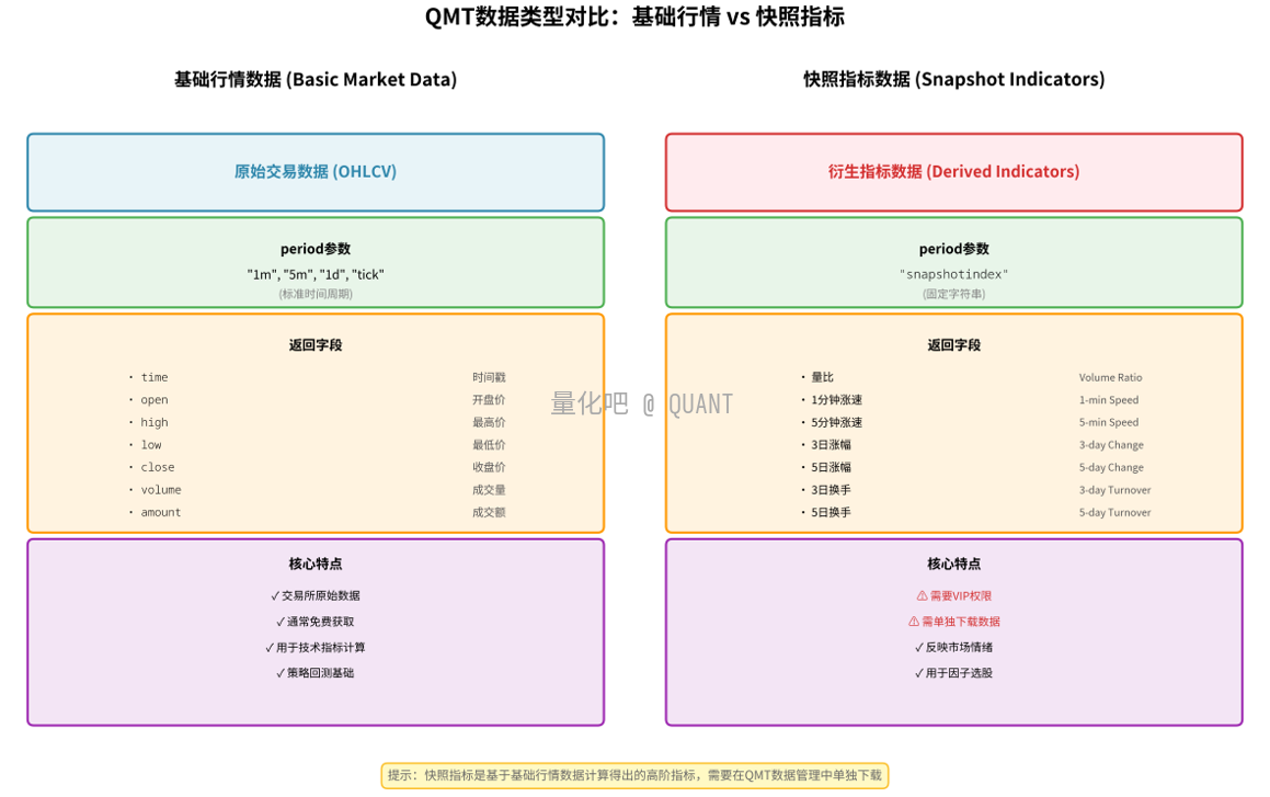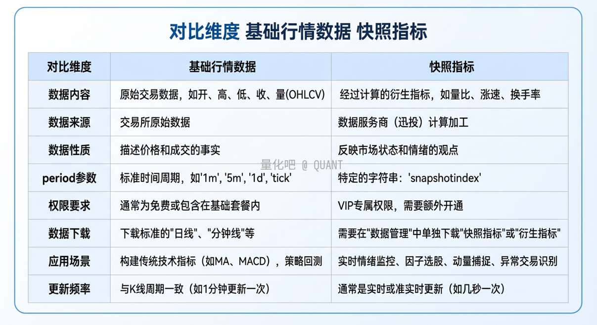 快照指标:由交易所给的原始数据,通过迅投加工而成(比如 “量比”、“涨速”、“换手率”等)