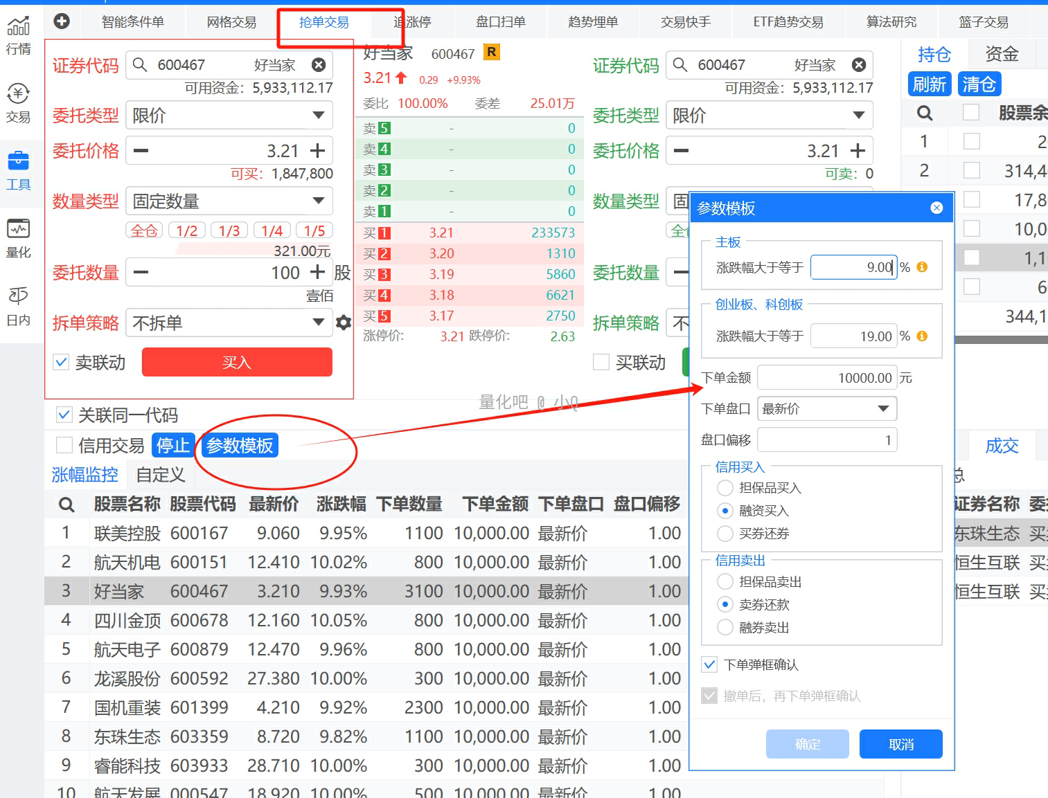 抢单交易的界面,点击“参数模板”,我们可以提前预设好 监控的板块涨幅,若达到预设的涨幅后 ,就会在我们涨幅监控列表里面展现出来,帮我们更加实时的监控个股动态。