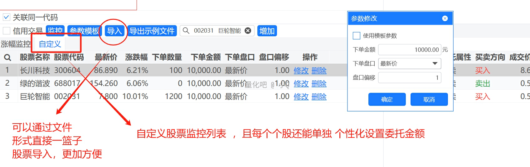 当然如果我们不想监控全市场 ,而是想指定自己的股票池监控,那也是可以的,我们可以通过文件的形式将看好的股票一篮子导入进入ptrade的监控列表,同时 个性化设置每个股票的委托金额和盘口偏移度 。