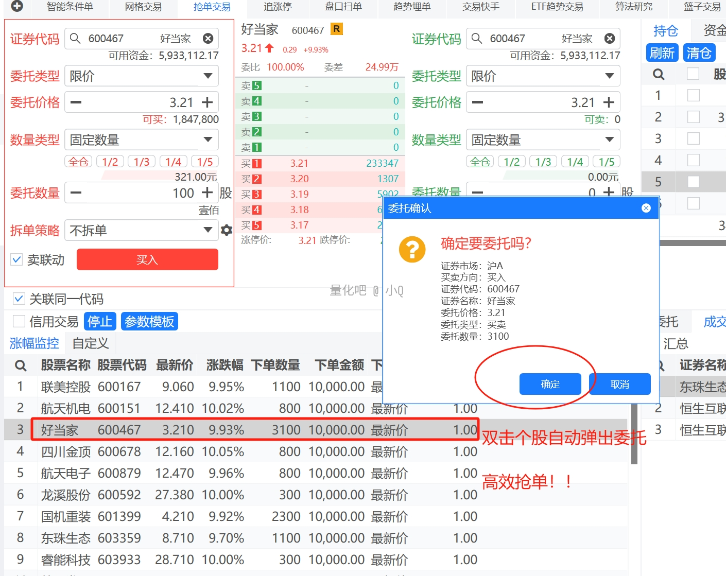 最后,不管我们 是全市场监控,还是指定股票池的监控 , 都可以直接双击监控的股票池直接快速下单!!以最快的速度捕捉市场机会!