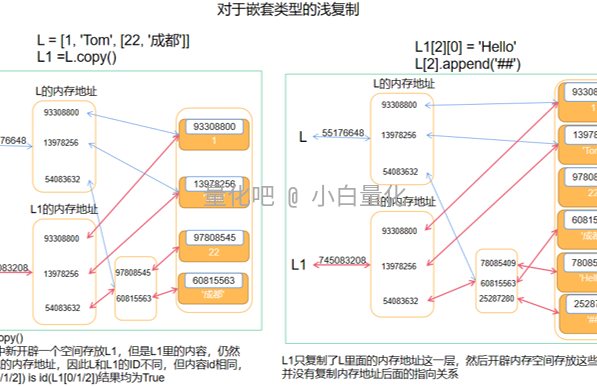 print(id(li[1]) == id(li2[1])) # True ==> 嵌套层内存地址相同 ==》是同一个对象 ==》 操作共享1.3 深拷贝【数据完全不共享】