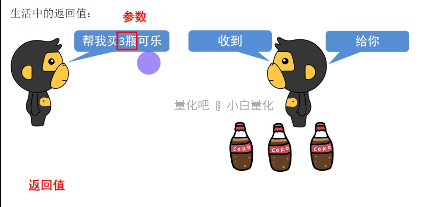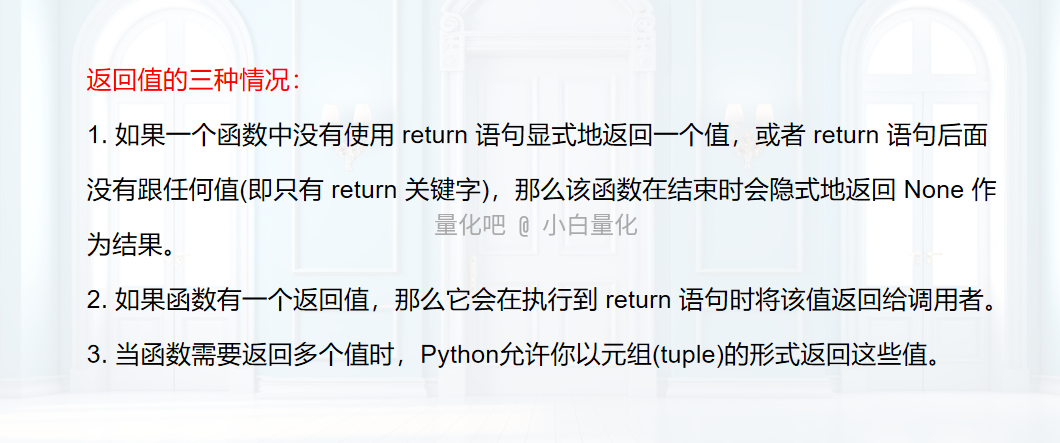 print("加班,继续工作!")(2)在函数中遇到return语句时,表示该函数将立即返回其后的值,并结束当前函数的执行。