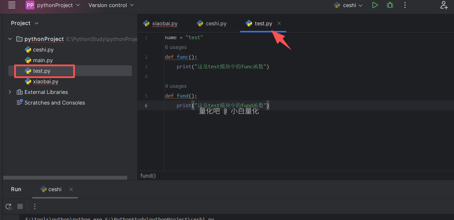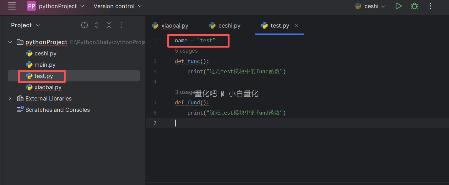 # 示例1 import test # 使用功能:模块名.功能 print(test.name) test.func() test.fund()