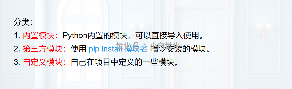 内置模块是Python自带的模块,可以直接导入使用。例如:os、copy、math、random、decimal等模块。