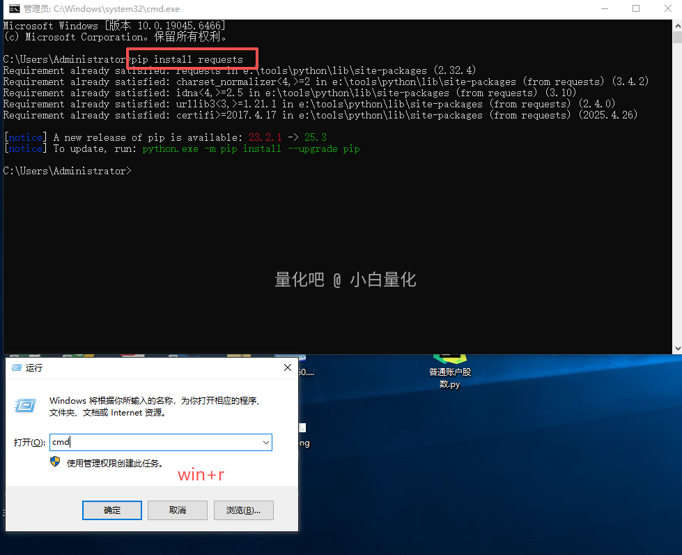 在cmd或终端中(win+r),使用pip命令:① pip install 模块名