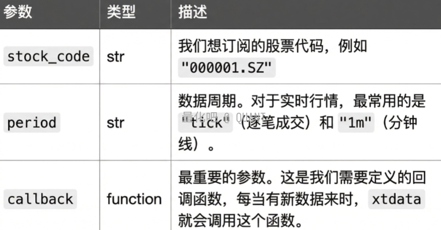 这个函数必须能接收一个参数(我们通常命名为 datas),xtdata会把最新的数据打包成一个字典放进这个参数