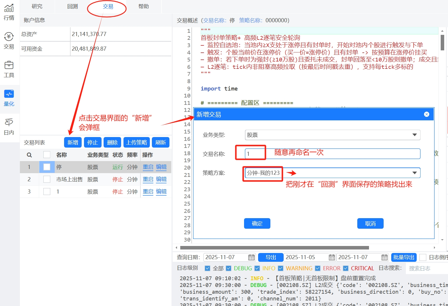 在回测界面将参数修改并保存后,直接点击“交易”界面,—— 点击“新增”,将之前的策略添加后,就可以开始运行策略。