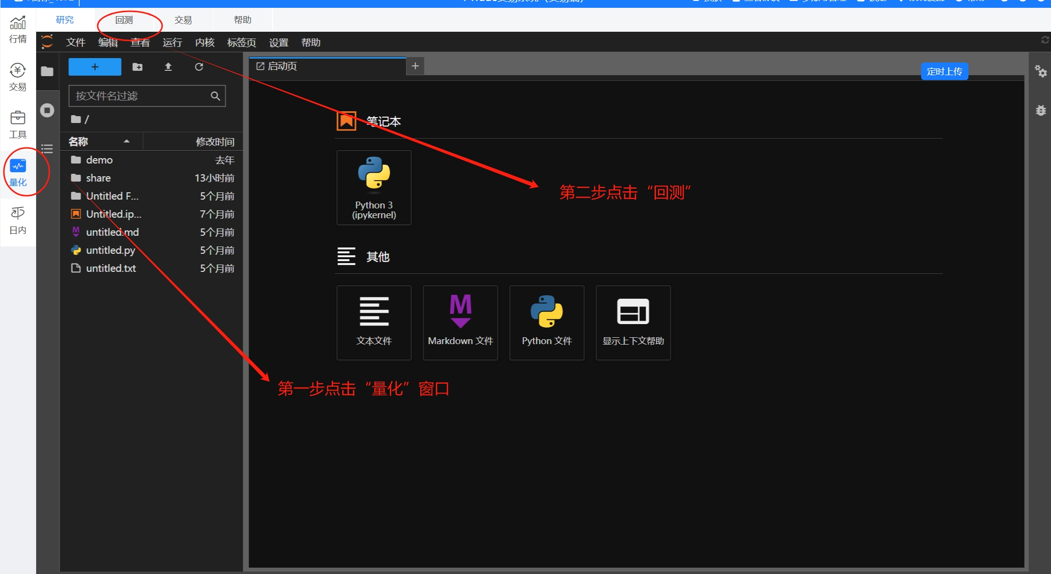 第一步进入PTrade的”量化“界面,并点击”回测“