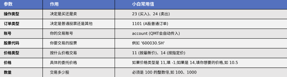 passorder 后面的几个参数(如策略名、是否立即下单等)在初学阶段可以暂时使用默认值。strategyName可以随便填,quickTrade填2表示立即下单,userOrderId填''空字符串即可,最后一个ContextInfo是固定要传的。
