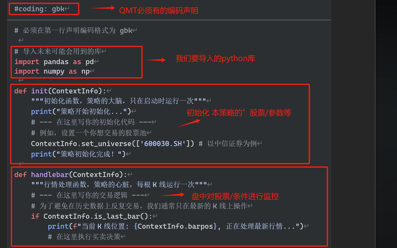 下面是一个最基础的策略模板,你可以复制它作为你所有策略的起点: (qmt的编码声明,导入的python库,init函数初始化函数的使用,handlebar函数在盘中执行策略)