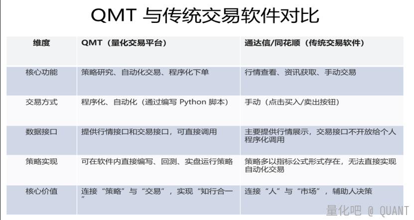 简单来说,QMT 是一款专为量化交易设计的综合性平台。要理解它的真正价值,我们必须明白它和我们常用的通达信、同花顺等传统炒股软件的根本区别在何处。