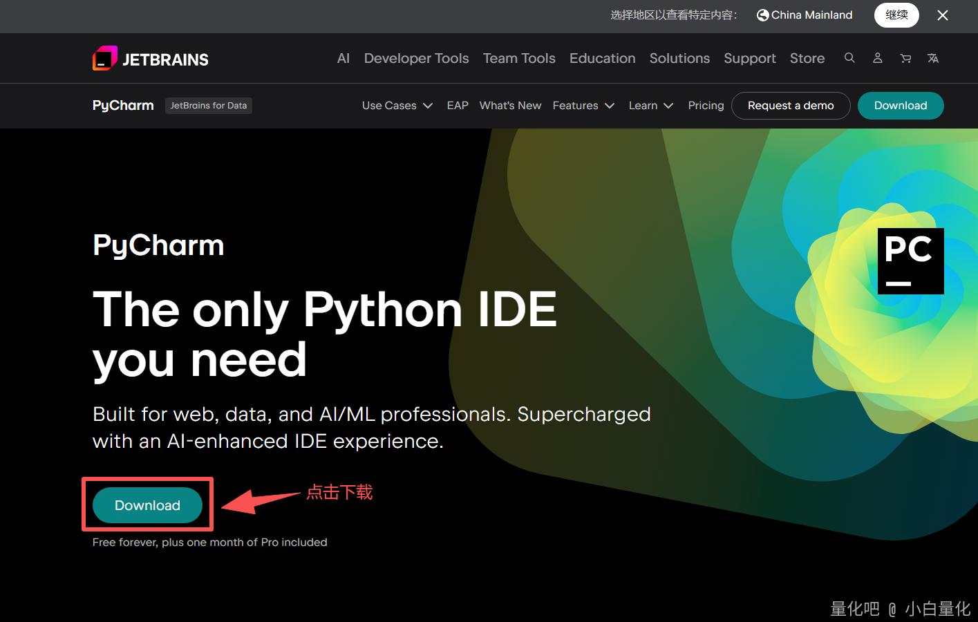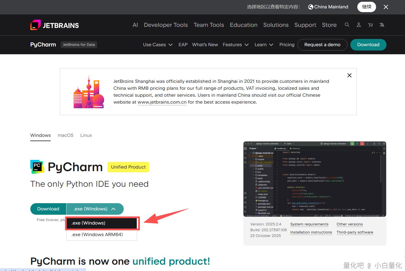 ① 直接进官网去下载:和python一样,也是服务器在国外,打开官网和下载的速度同样比较慢,下载的版本是最新版,这个看个人习惯,小白用的是PyCharm 2023.2.5版本