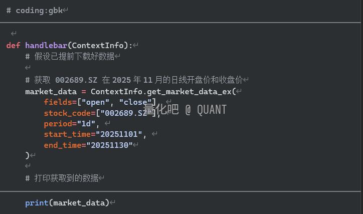 执行后, 将会是一个包含指定股票在11月份每个交易日的开盘价和收盘价的数据结构,我们可以直接在策略中使用它进行计算和判断。