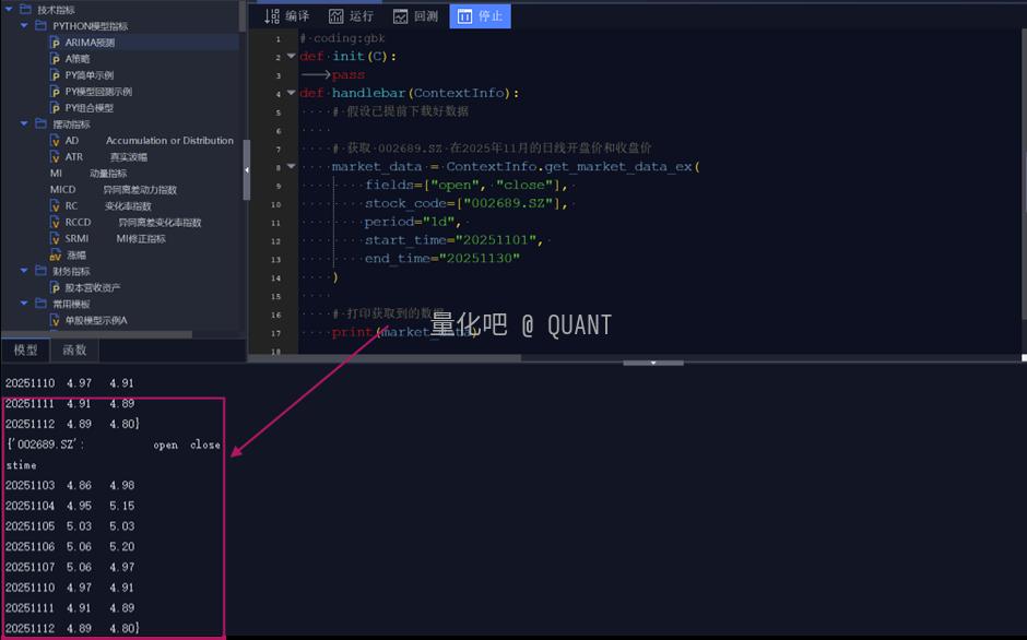 接下来我们可以直接在 QMT 的编辑器里面开始看打印结果: