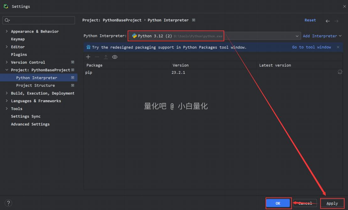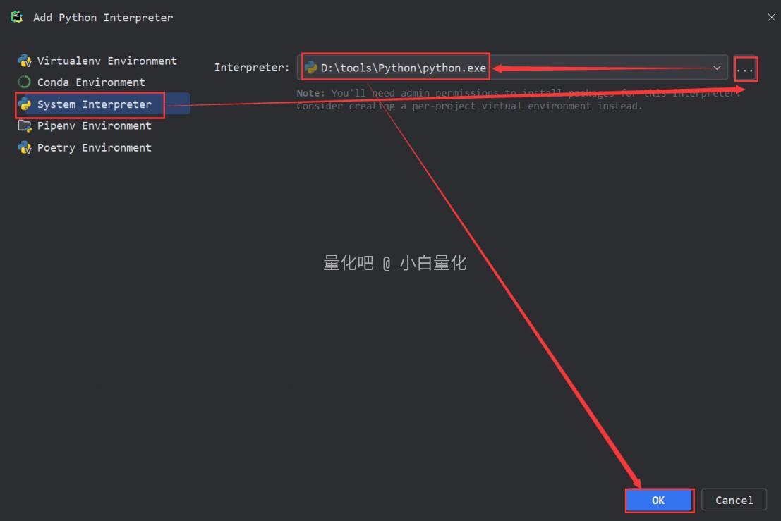 2. 选择 System Interpreter [系统解释器],点击 ... 选择已安装的Python解释器,然后点击 OK 。