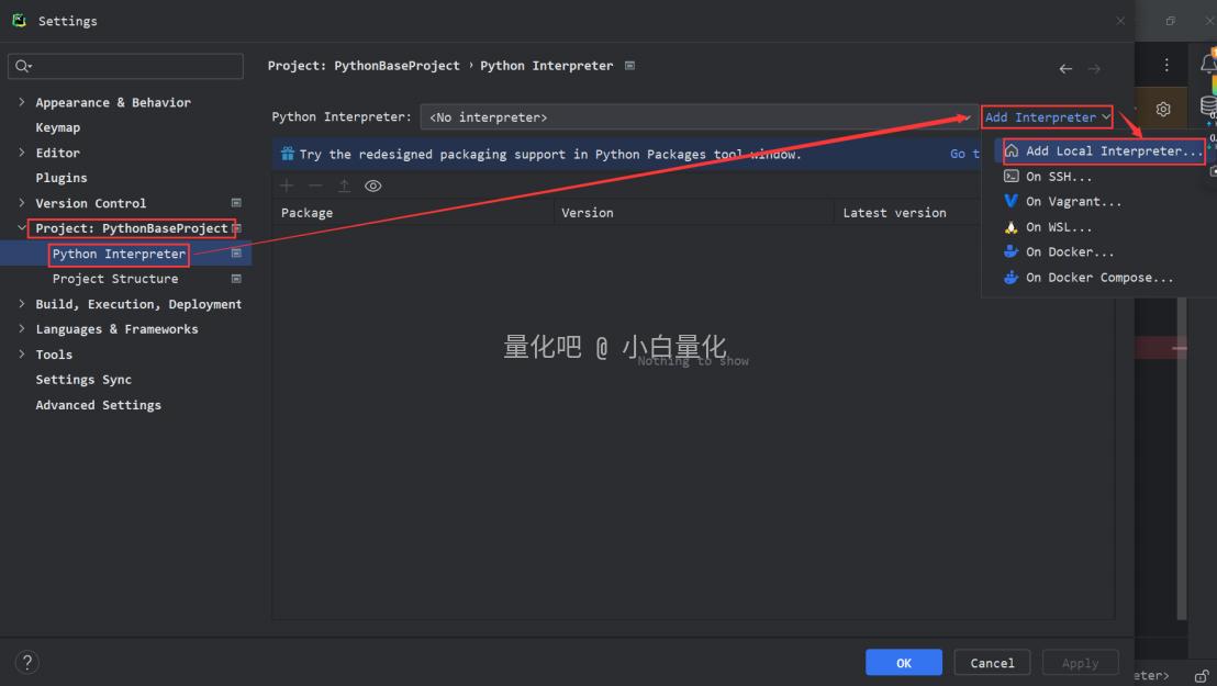 1. Settings [设置]界面点击 Project: 项目名 [项目]下的 Python Interpreter [Python 解释器],点击 AddInterpreter [添加解释器],选择 Add Local Interpreter [添加本地解释器]。